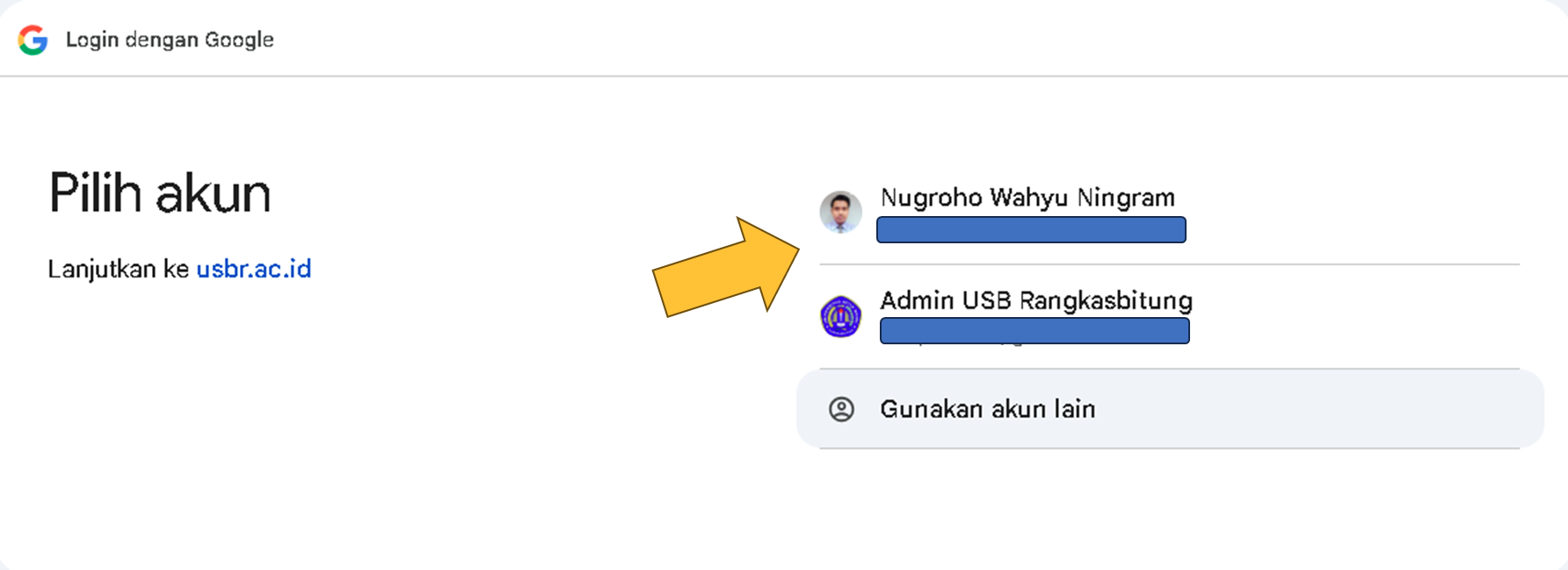 - Jika pilihan akun google Anda tidak tampil, silakan login terlebih dahulu pada akun google Anda. Lengkapi tahapan login sampai berhasil. Jika mengalami kendala login google, silakan gunakan fitur lupa sandi pada halaman google anda. Lewati tahapan ini ke tahap nomor 6 jika Anda sudah memiliki daftar akun google seperti contoh tertera pada tahapan nomor 3.
