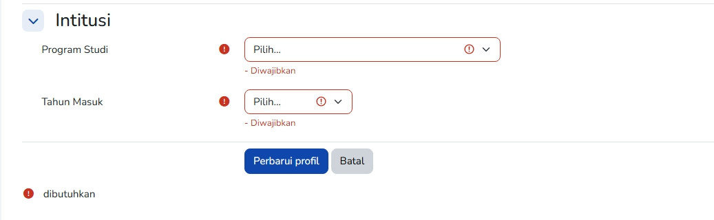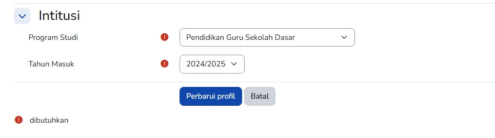 • User yang telah berhasil masuk kedalam portal LMS, wajib melakukan update data Program Studi dan Tahun masuk pada laman profil https://lms.usbr.ac.id/user/edit.php